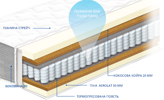 Помірно жорсткий високий двосторонній матрац на основі ортопедичного блоку Pocket Spring незалежних пружин, кожна з яких діє автономно, має окремий чохол. Власне виробництво блоків пружин забезпечує контроль якості та вигідну ціну матраца.