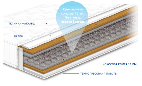 Двосторонній економічний пружинний матрац з ортопедичним ефектом, із застосуванням з двох боків кокосової койри, що надає матрацу додаткову жорсткість, має відмінні терморегулюючі та антибактеріальні властивості.