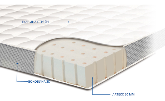 Футон Latex має велику висоту до 7 см. Боковини футона виконані з тканини-аератора 3D, що пропускає повітря тільки назовні. Тканина чохла м’який стрейч.
