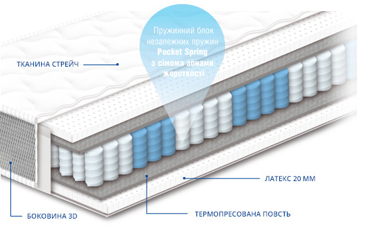 Двосторонній пружинний матрац з поліпшеним ортопедичним і анатомічним ефектом, на основі блоку незалежних пружин Pocket Spring з 7-ома диференційованими зонами жорсткості. Основу м’якого шару становить латекс — унікальний матеріал зі спіненого соку каучукового дерева гевея — еластичний, антибактеріальний, терморегулюючий, забезпечує вільний кровообіг під час сну.