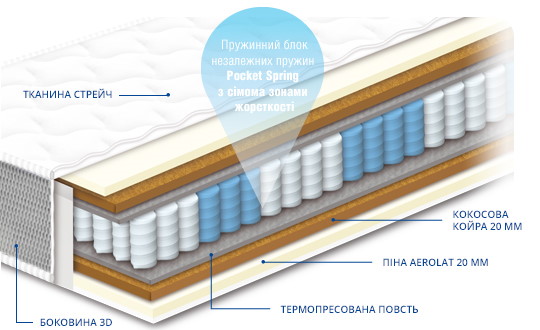 Двосторонній жорсткий пружинний матрац з поліпшеним ортопедичним і анатомічним ефектом на основі блоку незалежних пружин Pocket Spring з 7-ома диференційованими зонами жорсткості, із застосуванням з двох боків шарів кокосової койри висотою 2 см. Відрізняється високою жорсткістю та еластичністю.